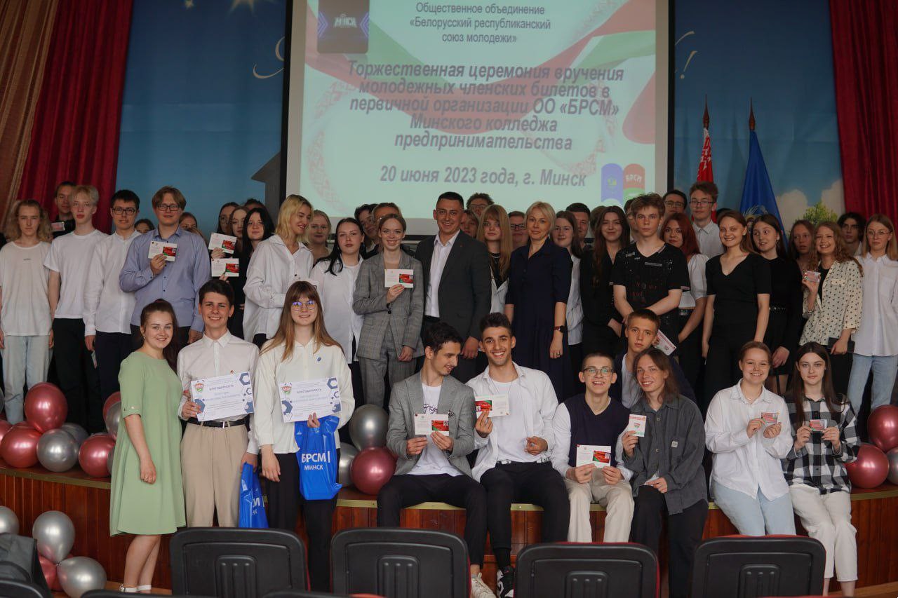 В рамках недели молодежи и студенчества 20 июня 2023 года в Минском колледже предпринимательства прошла церемония торжественного вручения молодежных членских билетов Общественного объединения "Бе...